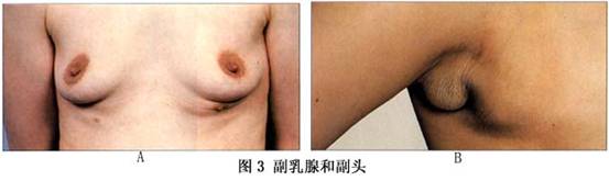 多乳头或多乳房最常发生于正常乳房的外上,即腋部副乳房,或正常乳房的下内侧,即正常乳房与脐之间(图3)。